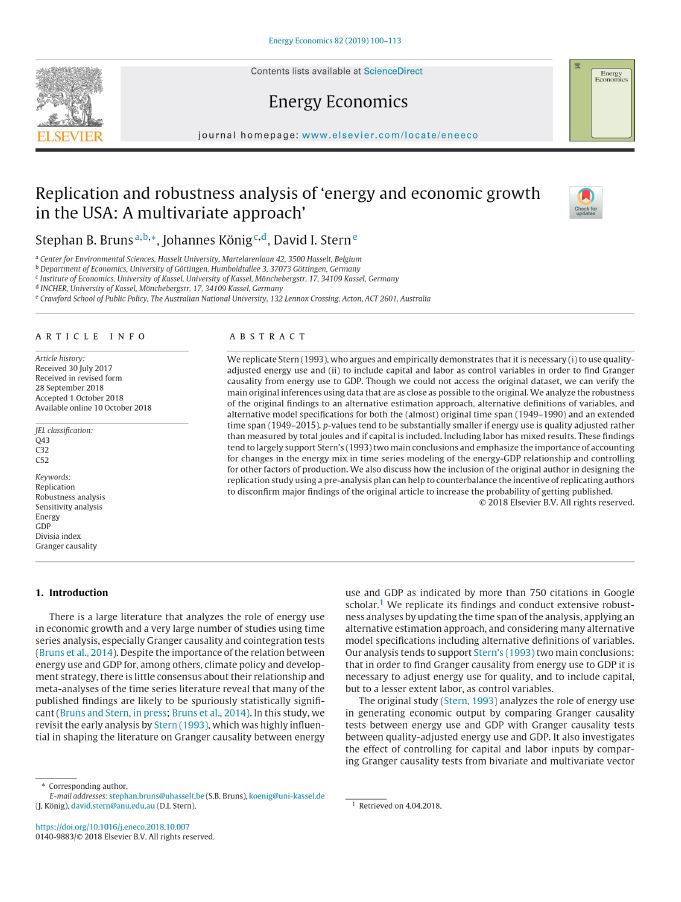 Abstract: We replicate Stern (1993), who argues and empirically demonstrates that it is necessary (i) to use quality-adjusted energy use and (ii) to include capital and labor as control variables in order to find Granger causality from energy use to GDP. Though we could not access the original dataset, we can verify the main original inferences using data that are as close as possible to the original. We analyze the robustness of the original findings to an alternative estimation approach, alternative definitions of variables, and alternative model specifications for both the (almost) original time span (1949–1990) and an extended time span (1949–2015). p-values tend to be substantially smaller if energy use is quality adjusted rather than measured by total joules and if capital is included. Including labor has mixed results. These findings tend to largely support Stern’s (1993) two main conclusions and emphasize the importance of accounting for changes in the energy mix in time series modeling of the energy-GDP relationship and controlling for other factors of production. We also discuss how the inclusion of the original author in designing the replication study using a pre-analysis plan can help to counterbalance the incentive of replicating authors to disconfirm major findings of the original article to increase the probability of getting published.