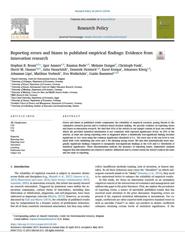Abstract: Errors and biases in published results compromise the reliability of empirical research, posing threats to the cumulative research process and to evidence-based decision making. We provide evidence on reporting errors and biases in innovation research. We find that 45% of the articles in our sample contain at least one result for which the provided statistical information is not consistent with reported significance levels. In 25% of the articles, at least one strong reporting error is diagnosed where a statistically non-significant finding becomes significant or vice versa using the common significance threshold of 0.1. The error rate at the test level is very small with 4.0% exhibiting any error and 1.4% showing strong errors. We also find systematically more marginally significant findings compared to marginally non-significant findings at the 0.05 and 0.1 thresholds of statistical significance. These discontinuities indicate the presence of reporting biases. Explorative analysis suggests that discontinuities are related to authors’ affiliations and to a lesser extent the article’s rank in the issue and the style of reporting.