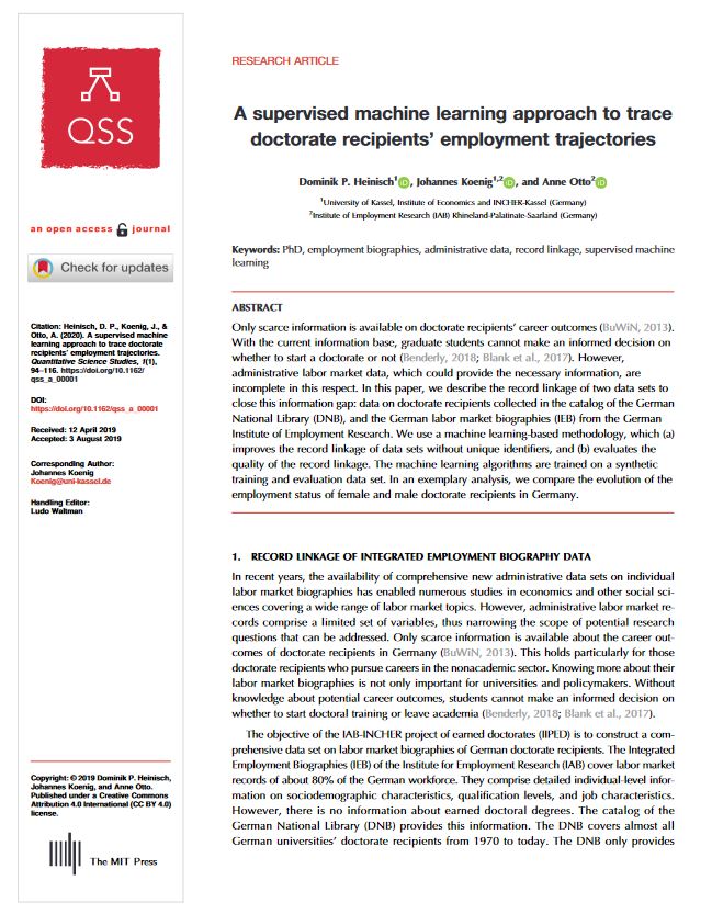 Abstract: Only scarce information is available on doctorate recipients’ career outcomes (BuWiN, 2013). With the current information base, graduate students cannot make an informed decision on whether to start a doctorate or not (Benderly, 2018; Blank et al., 2017). However, administrative labor market data, which could provide the necessary information, are incomplete in this respect. In this paper, we describe the record linkage of two data sets to close this information gap: data on doctorate recipients collected in the catalog of the German National Library (DNB), and the German labor market biographies (IEB) from the German Institute of Employment Research. We use a machine learning-based methodology, which (a) improves the record linkage of data sets without unique identifiers, and (b) evaluates the quality of the record linkage. The machine learning algorithms are trained on a synthetic training and evaluation data set. In an exemplary analysis, we compare the evolution of the employment status of female and male doctorate recipients in Germany.